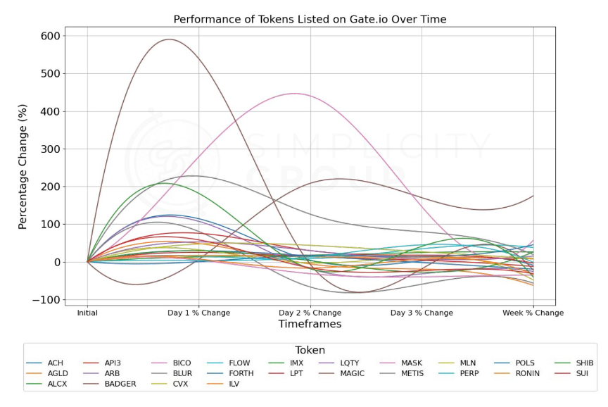 Tokens listed on Gate.io exhibited a trend of strong initial increases followed by declines;