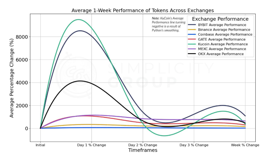 Last week, research institution Simplicity Group (@SimplicityWeb3) used data to analyze the performance of over 30 tokens listed on Binance, OKX, Bybit, Kucoin, Coinbase, Gate, and MEXC, seven common CEXs, one week after listing.