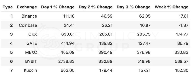 MEXC exhibited the best sustainability, maintaining high increases from the first day to one week later;