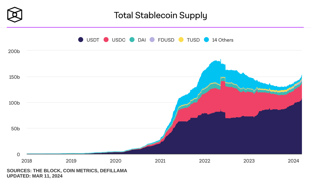 - Market Trends: According to data from The Block, the total supply of stablecoins has been steadily increasing since 2020, peaking at $180.4 billion on March 30, 2022. Although the supply decreased due to a downturn in the cryptocurrency market, it began to rise again starting in September 2023. As of March 12, 2024, the total supply of stablecoins is approximately $153.6 billion.
