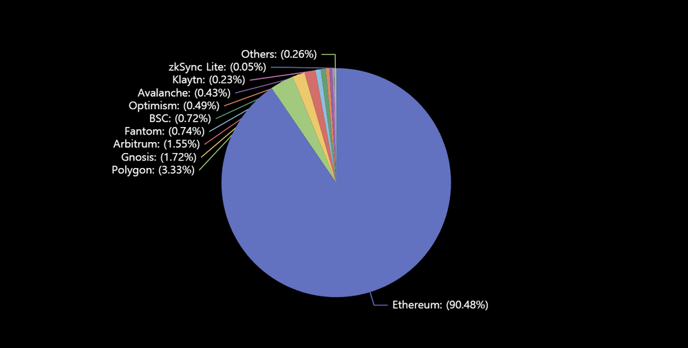 - DAI is used across various blockchains, with 90% of its issuance concentrated on Ethereum. This concentration is due to the fact that the main dApp for generating DAI, Spark, currently only supports Ethereum and Gnosis chains.