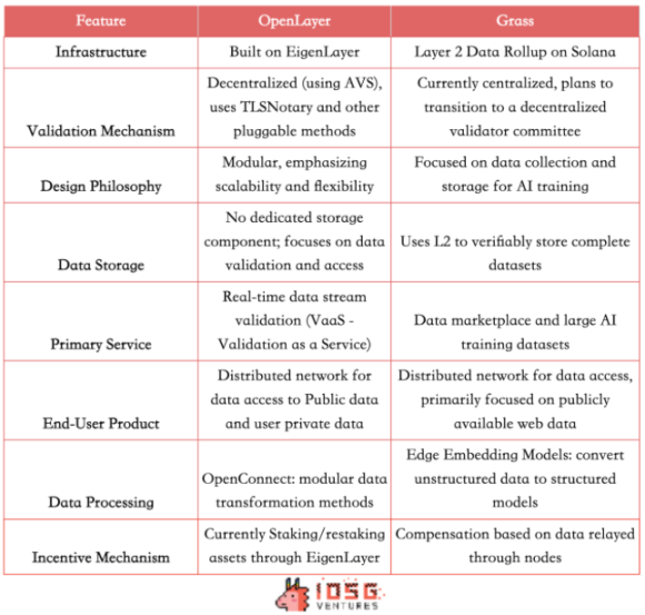 Grass uses a Layer 2 Data Rollup architecture on Solana, currently employing a centralized verification mechanism with a single validator. In contrast, OpenLayer, as one of the first AVS, is built on EigenLayer, utilizing economic incentives and forfeiture mechanisms to achieve a decentralized verification mechanism. It also adopts a modular design, emphasizing the scalability and flexibility of data verification services.