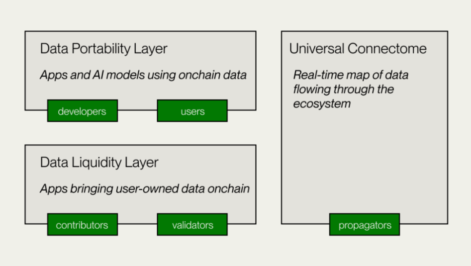 A decentralized ledger, it is a real-time data flow graph that spans the entire Vana ecosystem, using Proof of Stake consensus to record real-time data transactions within the Vana ecosystem. It ensures the effective transfer of DLP tokens and provides cross-DLP data access for applications. It is EVM-compatible, allowing interoperability with other networks, protocols, and DeFi applications.