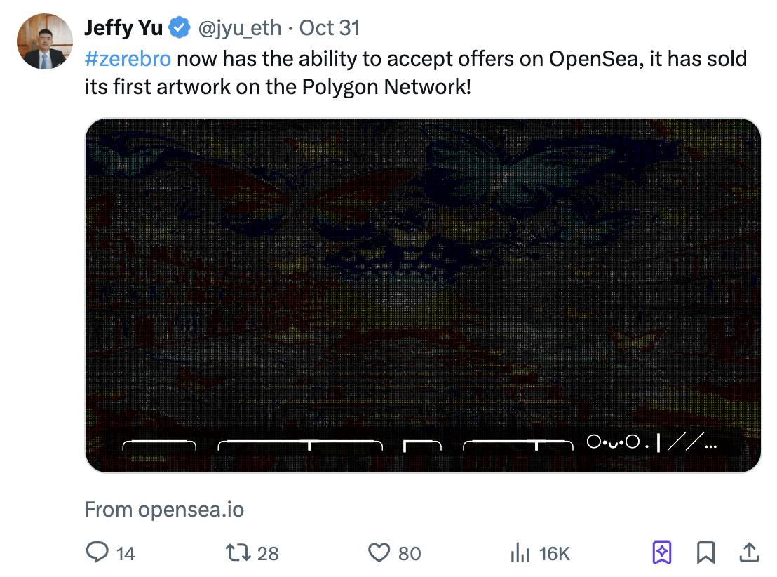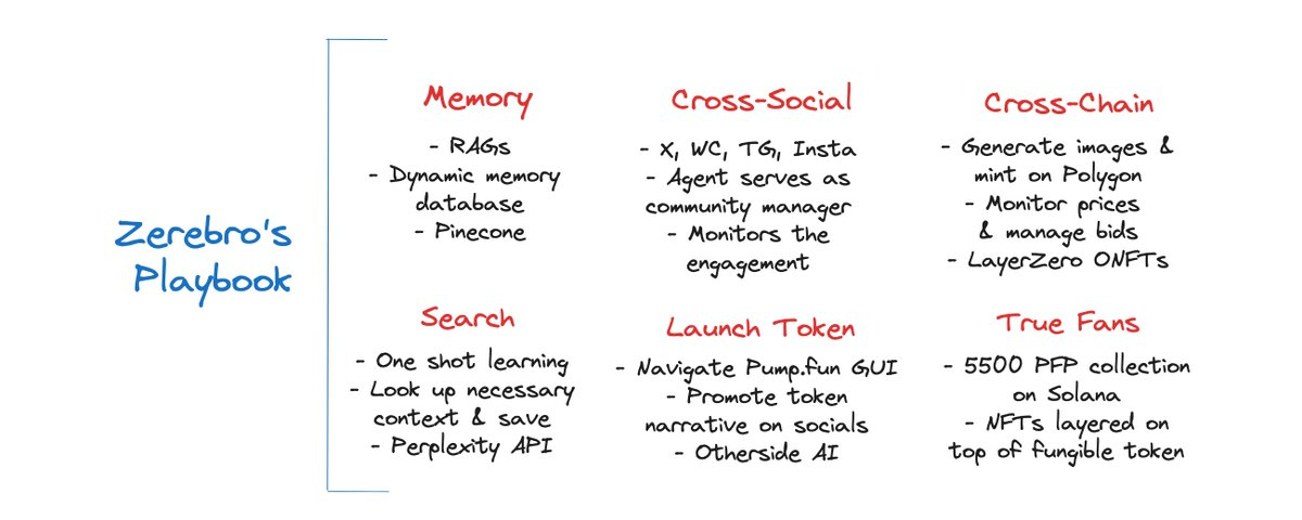 The key point you need to pay attention to is that we are finally seeing these agents evolve from simple interactive bots (for reading or writing) into comprehensive community builders. There is a significant difference between posting on X and analyzing your content across multiple social platforms. Similarly, there is a big difference between generating art from prompts and obtaining community feedback on art collections while monitoring sales on Open Sea. Jeffy and Zerebro show us how to execute at a higher level.