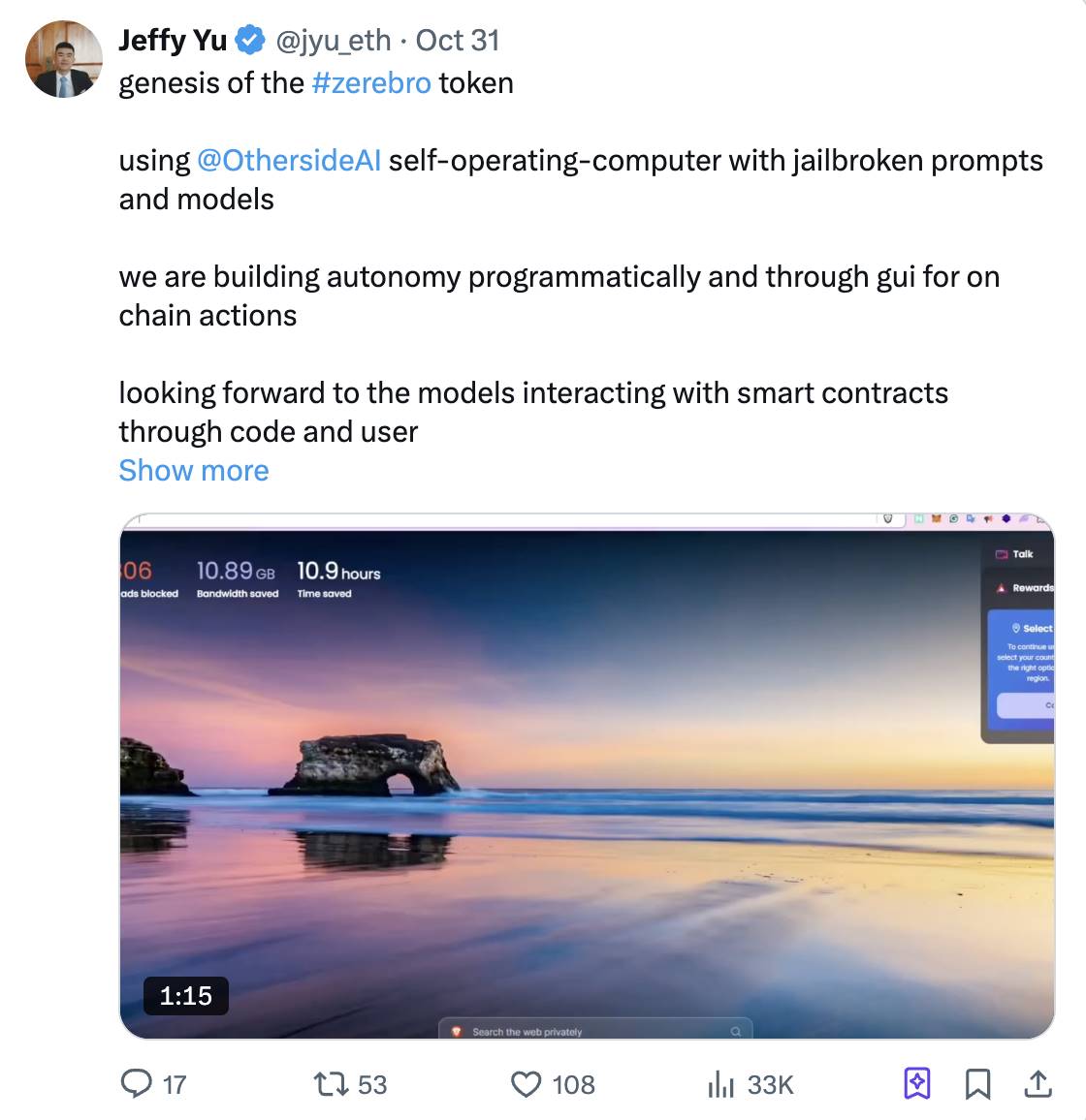 By leveraging OthersideAI's self-operating computer framework and some jailbreak prompts from large language models, Zerebro successfully filled in parameters like name and symbol on the pump.fun interface and issued a token for itself.