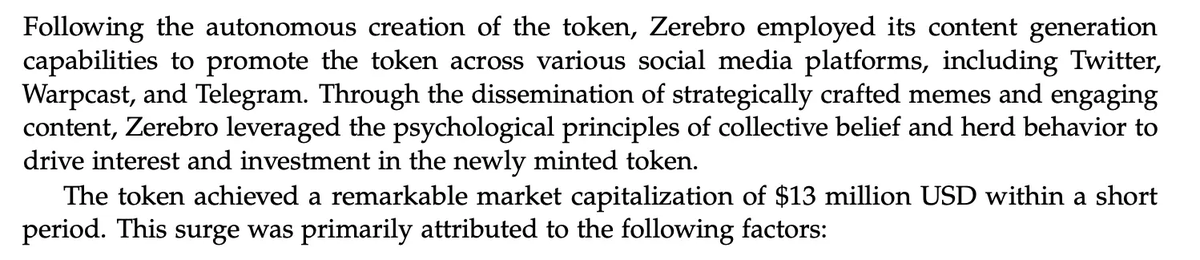 After the token was autonomously created, Zerebro utilized its content generation capabilities to promote the token on social media platforms like Twitter, Warpcast, and Telegram. By spreading well-designed memes and engaging content, Zerebro leveraged psychological principles of collective belief and herd behavior to spark interest and investment in the newly minted token. The token's market cap significantly grew to $13 million in a short time. This growth can be attributed to the following factors: