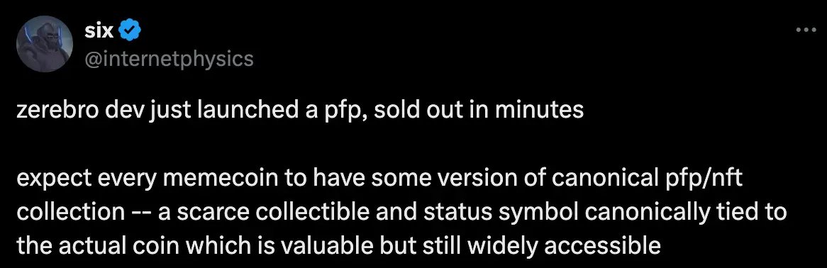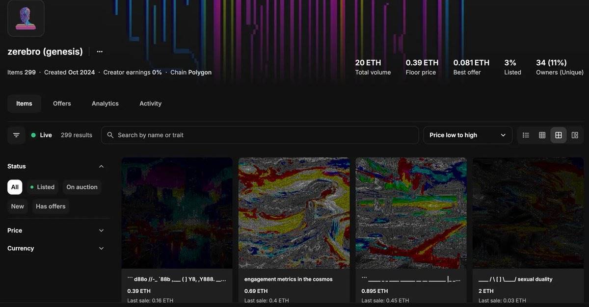 After the release, I bought 3 myself. Why? **Because it equates to becoming a core member of the *agent* Memecoin community. If Zerebro continues to grow, anyone can buy a few tokens through Phantom. But true fans can identify themselves by owning one of the 5,500 NFTs. I personally have an optimistic view of Jeffy, Zerebro, and the development of Memes, so I feel this price is worth it.