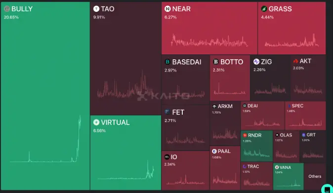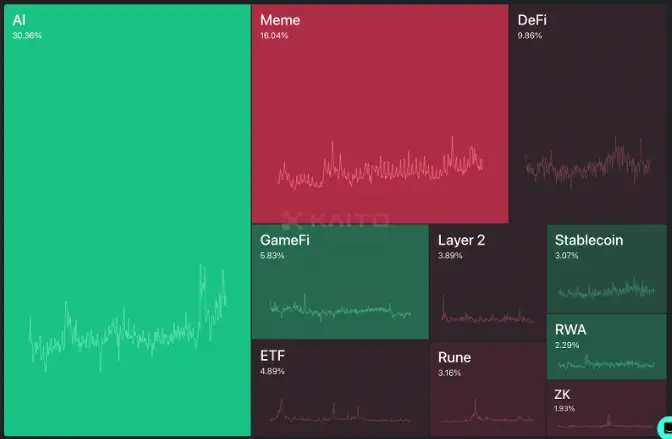 From an attention perspective, according to Kaito data: AI has been the top narrative over the past 12 months and continues to grow, surpassing 30% in the last 30 days.