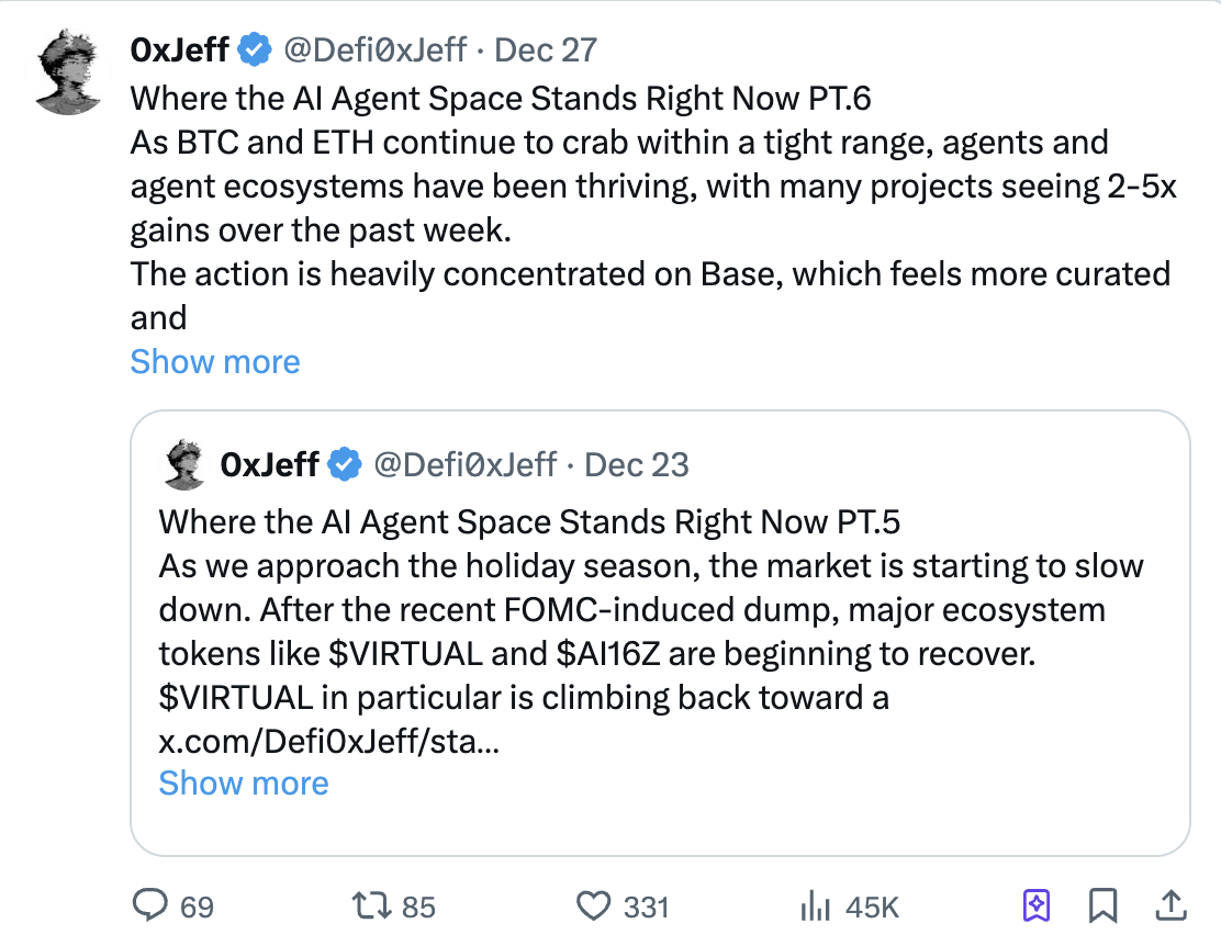 For example, I cover multiple ecosystems including Base and Solana, looking for investment opportunities in agents. While I have a certain preference for Virtuals (often tweeting in support of them), I always maintain an open mindset.