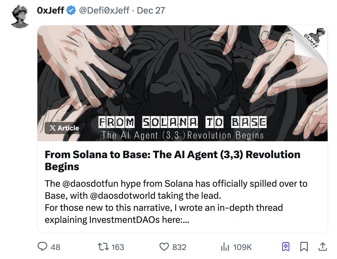 First, don't limit yourself to a single ecosystem. Whether it's Base or Solana, whether it's Virtuals or ai16z, every ecosystem has opportunities worth exploring.