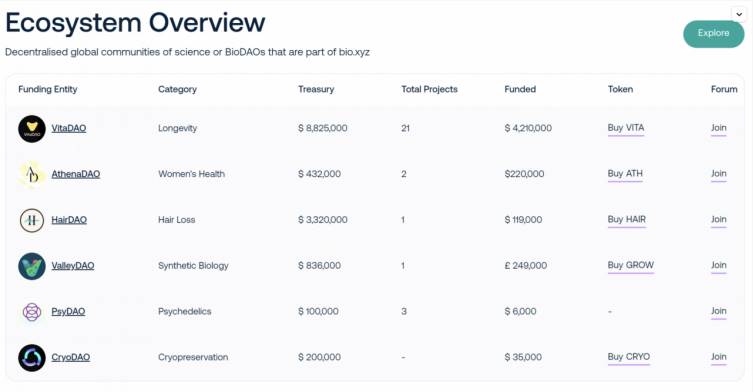 - VitaDAO: The world's first decentralized biotechnology DAO focused on longevity research and the largest funder on the Molecule platform.