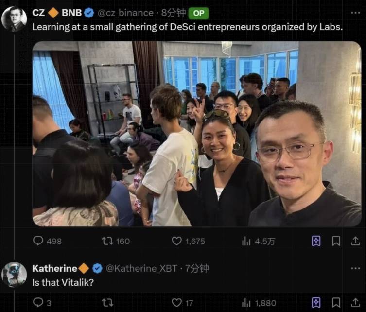 On November 13, 2024, Binance founder CZ posted on social platform X, "Learning at a small DeSci entrepreneur gathering organized by Binance Labs," along with a photo of himself with Vitalik. At this event, Vitalik also showcased VitaDAO's first longevity product—VD001, a natural high-dose spermidine supplement approved by the Thai FDA.