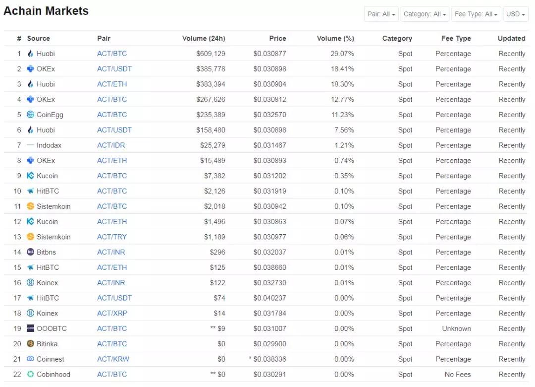 根据CoinmarketCap数据,支持ACT交易多达20家交易所,其中有国内一流交易所Huobi,及准一流交易所OKEx、Kucoin,另外还有其他常规交易所支持。