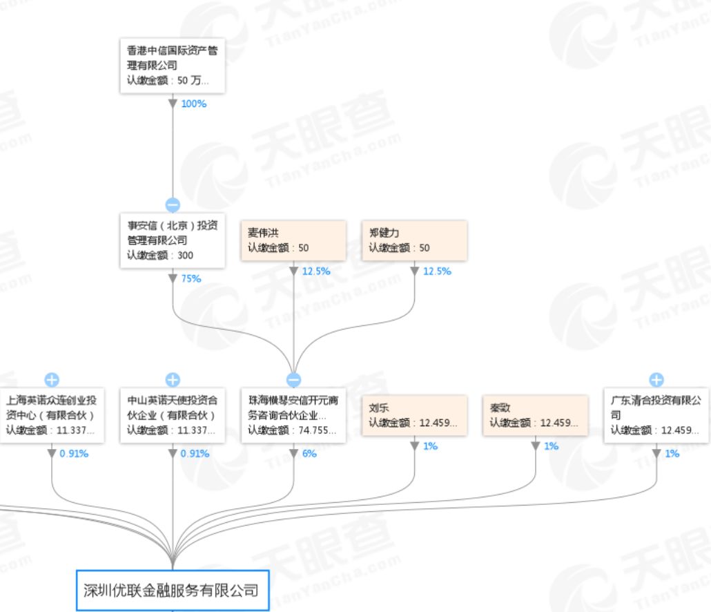 值得注意的是,香港中信国际资产管理有限公司并不是直接投资优联金服,而是嵌套了两层股权关系,间接持有4.5%的股权;