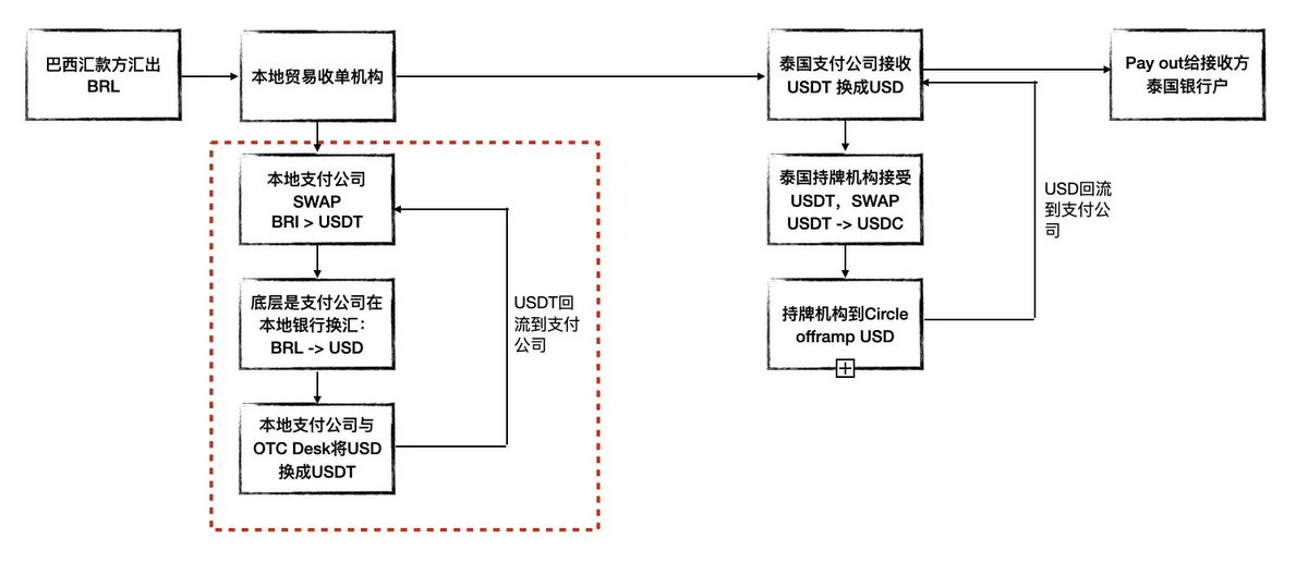 Let’s first discuss the solution under stablecoins: local OTC/payment companies receive foreign exchange, which they convert into USD at banks. The USD then needs to be exchanged for USDT through an OTC like Cumberland, and the transfer is completed on-chain with USDT. At the receiving end, there must be another OTC conversion from USDT to USD, followed by a bank exchange into the local currency. In this solution, the transfer and settlement of USDT become very simple, but the difficulty and moat lie in the entire OTC network. If using USDC, the process is a bit more convenient, as it can be done directly at compliant venues with Circle for deposits and withdrawals.