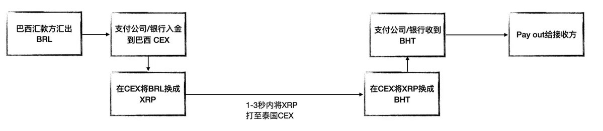 Ripple actually offers a simpler solution than stablecoins. Its process involves converting foreign currency into XRP through local banks or payment institutions, sending XRP to the receiving country's CEX, and then converting XRP into the local currency. The following diagram uses Brazil to Thailand as an example, with the currency chain being BRL -> XRP -> BHT. In other words, Ripple uses XRP as a bridge currency to recreate a foreign exchange market.