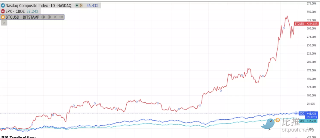 The S&P 500 measures the performance of large-cap stocks, while the Nasdaq Composite Index tracks 2,500 market-cap-weighted stocks on the Nasdaq. There is a noticeable trend of synchronization between the two, but Bitcoin exhibits stronger volatility—especially after significant events, indicating that traders and investors are beginning to view Bitcoin similarly to stocks.