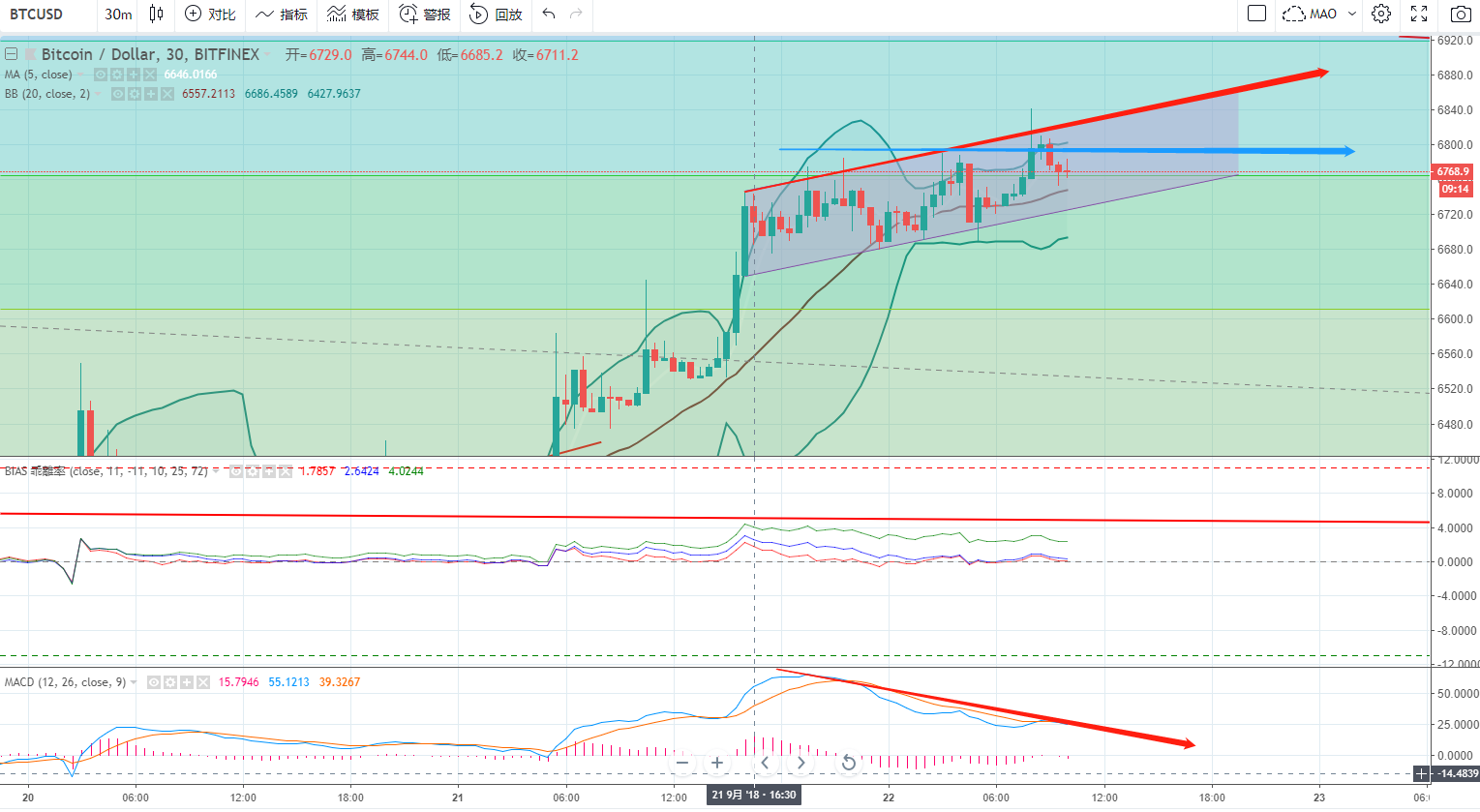 另外我们还得观察BTC的走势,BTC的盘面不需要拉升多少,但是要保持一个稳定。因为散户和合约用户都是主要在BTC的盘面里面,BTC只要稳定下来,说明整个散户不会捣乱,那主力拉升其他币种面对压力线也会比较从容。现在BTC在上飘旗形整理,跌破旗形区间走弱。