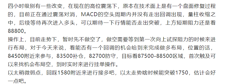 In terms of operations, we will temporarily continue to hold the long position with an average price of 84000. The stop-loss remains unchanged. If the market drops again and hits the stop-loss, we will consider positioning to go long at 81500. If the market rises, we will consider shorting when it first touches around 88000. We will also notify you of real-time market conditions during trading.