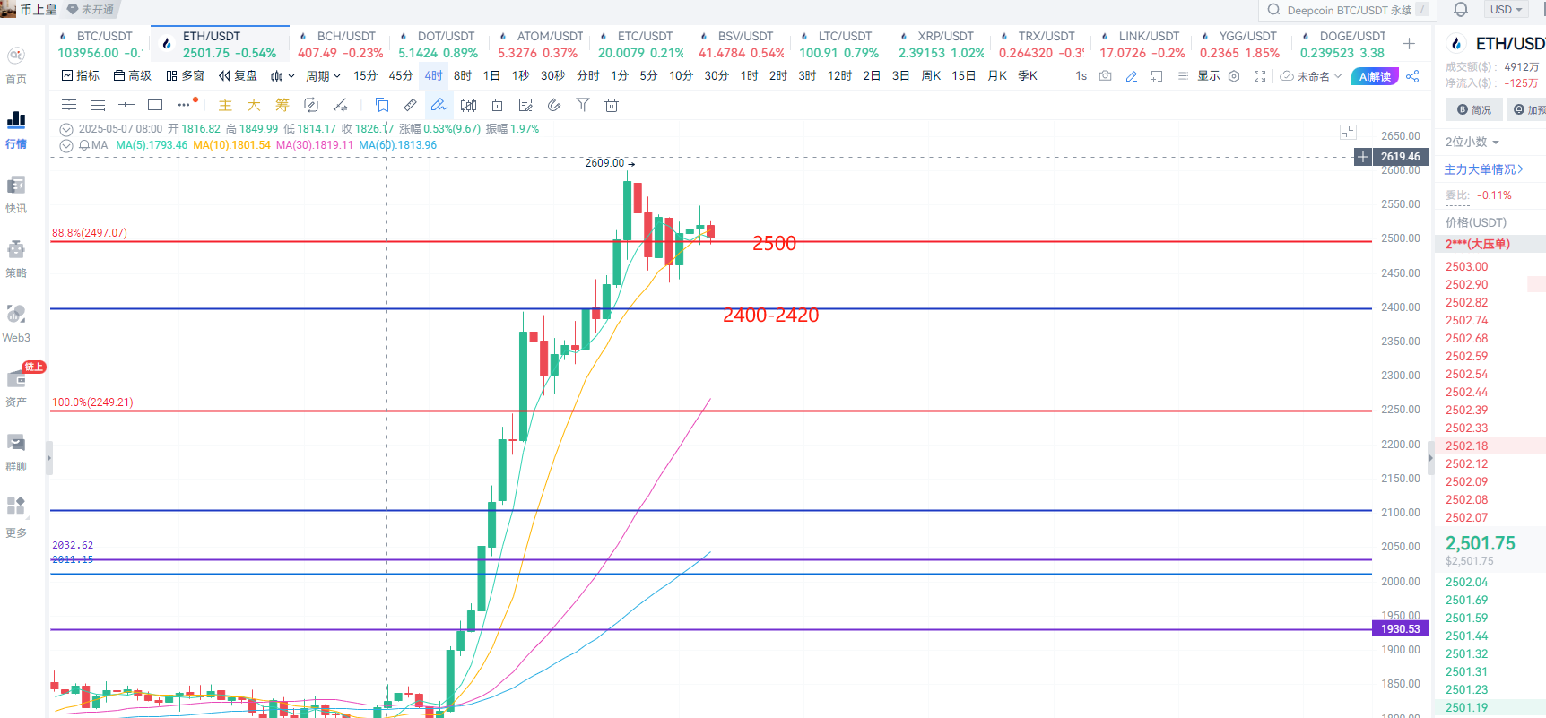 From the four-hour chart of Ethereum, the previous top has been broken, which means that the pressure around 2500 has been established. From a short-term perspective, it is currently at a recent support level. There are no more options regarding pressure, so we look for opportunities around 2500 for a rebound while ensuring defense. If it breaks down, retreating to 2400-2420 is more reasonable.