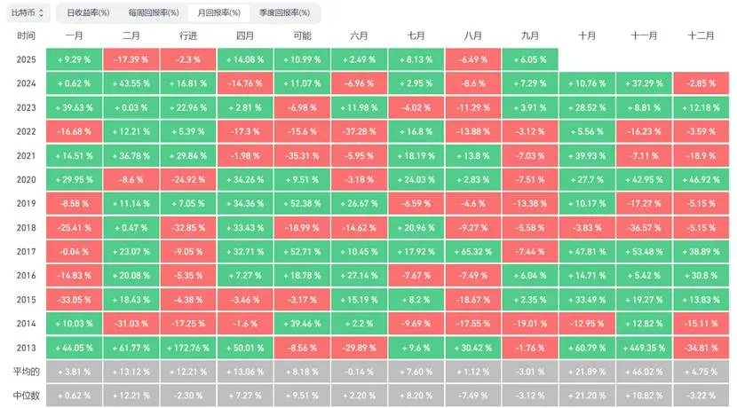 Overall, last week the cryptocurrency market was dragged down by the September curse, with net outflows of funds and a shrinking total market value, but prices stabilized and sentiment warmed over the weekend, shifting from panic to cautious optimism. Historical data shows that from 2013 to 2024, BTC's average return in October was about +21.89%, significantly higher than September's -3.91%, suggesting investors may lean towards betting on the "Uptober" window.