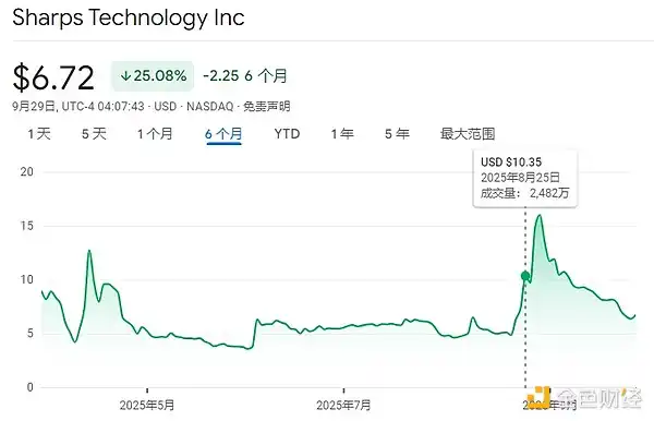 After news of Sharps Technology's plans to establish a SOL treasury spread, its stock price peaked above $16 before retreating, and as of the time of writing, it is reported at $6.72.