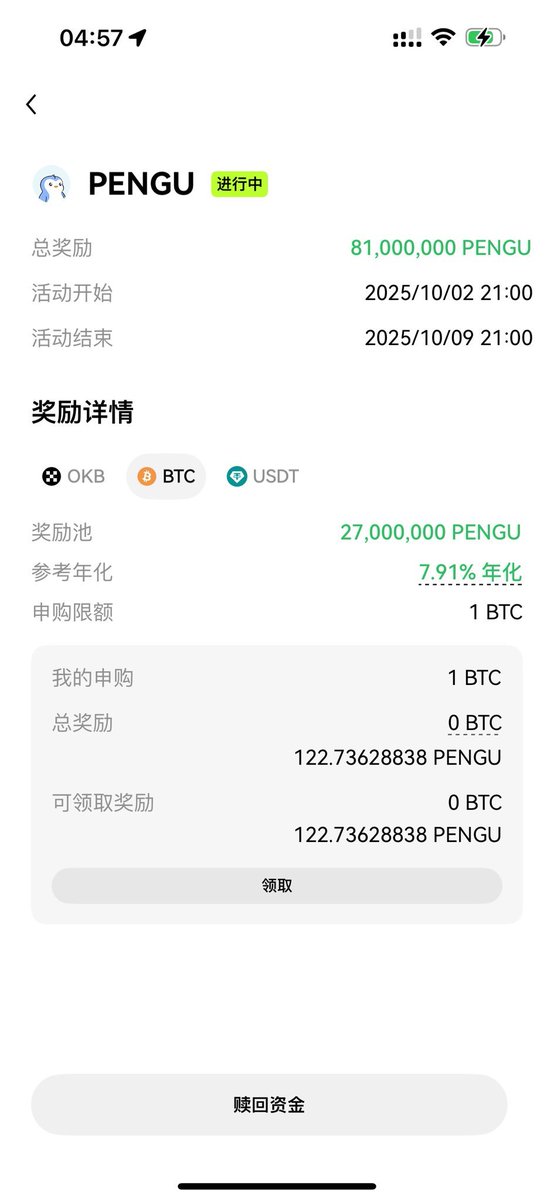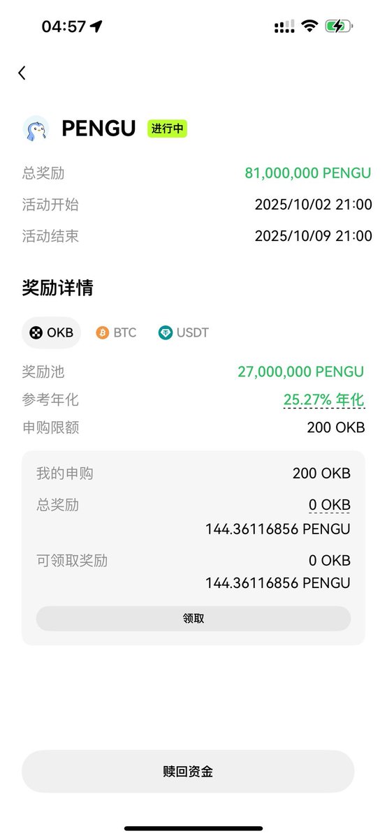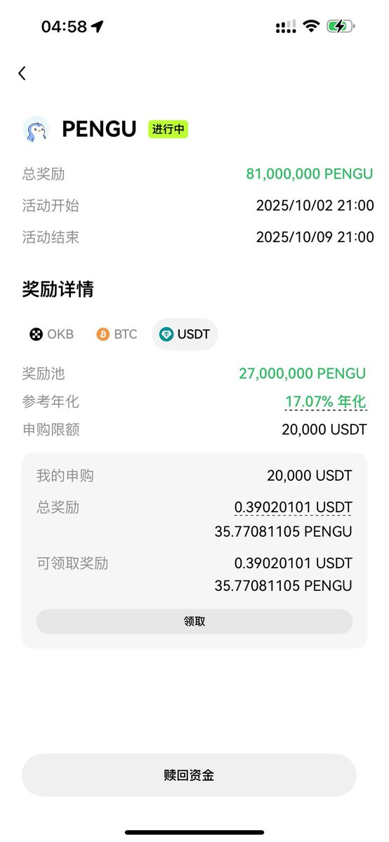 Thanks to @0xbiubiubiu for the reminder, I seamlessly linked to the new PENGU airdrop event. This time, the investment cost has shrunk a bit; I only have 200 OKB, 1 BTC, and 20,000 USDT, which is more than half less than last time. Although the capital occupation rate is lower, for me, apart from USDT, most of it is basically real estate, and the revenue has also decreased.