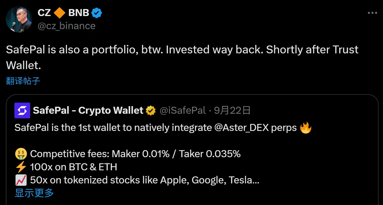 There is also a particularly compelling signal that many have overlooked: SafePal itself was an early investor in APX Finance (the predecessor of Aster), and this time being retweeted by CZ coincides with SafePal being the "first wallet natively integrated with Aster."