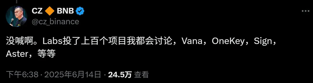 • On June 14, CZ responded to community doubts about his "hype for Aster" by naming a batch of invested projects, including Vana, OneKey, Sign, Aster, etc., laying the groundwork;
