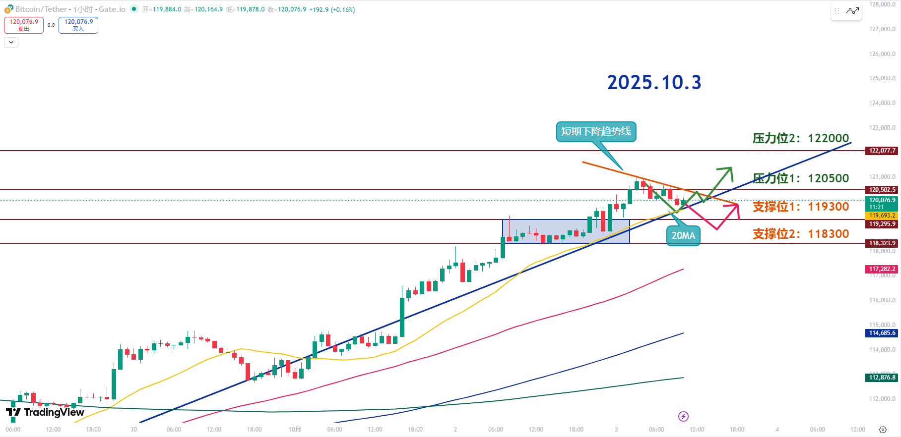 The 20-day moving average on the 1-hour chart is still trending upward, and the short-term trend hasn't broken. Just follow the pullback and go long. This moving average itself is an emotional line; a slight dip below it is not a big deal, so we can directly focus on the support zone from 118.3K to 119.3K; if it breaks, we will talk then.