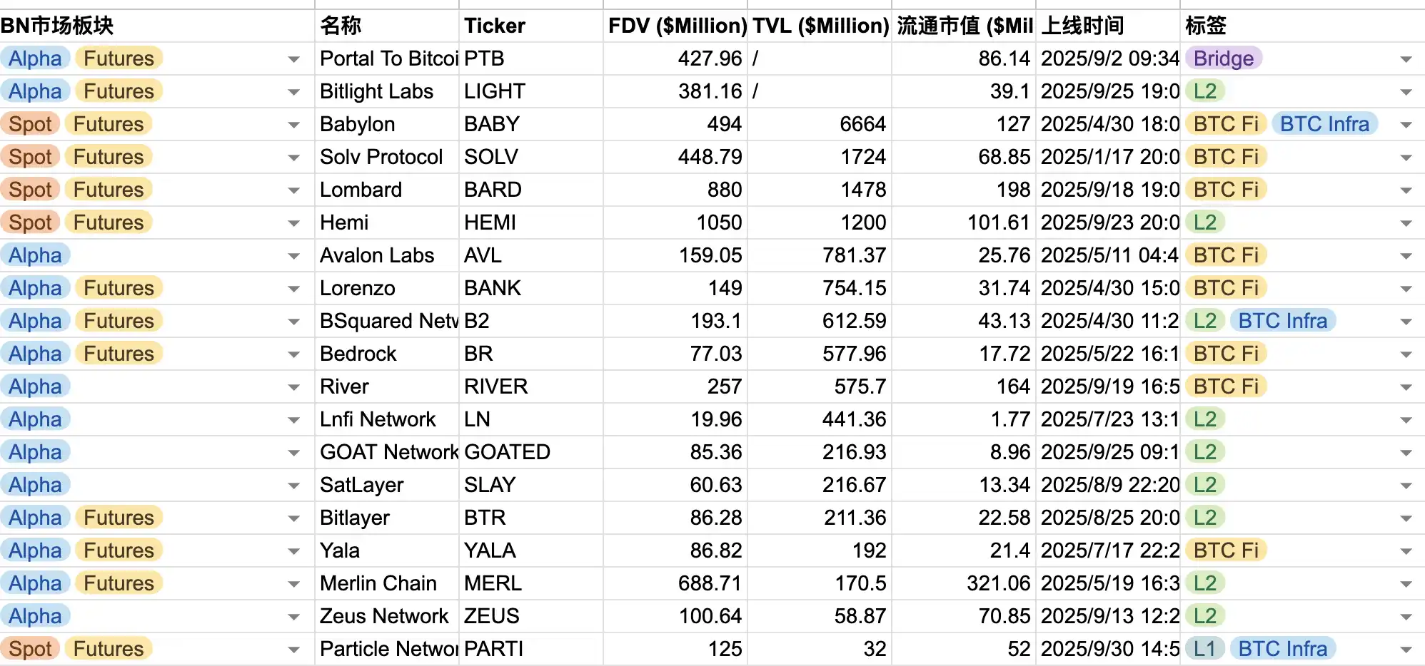 Recently, according to statistics, Binance has launched over 20 BTC ecosystem projects in the spot and Alpha sectors, with the data source for the statistics table: click here; most projects have already launched in the Alpha sector + contracts, with only a few projects launching solely in Alpha. Among them, 3 projects have already launched in the Binance spot sector. The BTC ecosystem comprehensively covers various directions such as cross-chain bridges, different technical paths of BTC L2, and BTC Fi. Nearly 2/3 of the projects maintain an FDV of over $100M, with only 3 projects having an FDV below $80M.