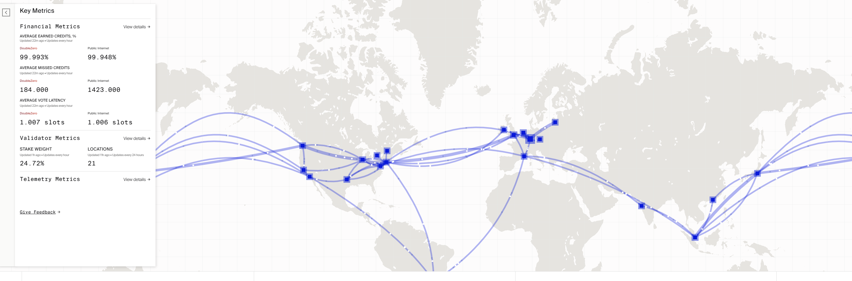 Technical Implementation: Unlike many projects that remain at the white paper stage, DoubleZero has already achieved real physical infrastructure operation. As of October 3, the number of its official public internet nodes has exceeded 1,300, with over 330 participating Solana network validators.