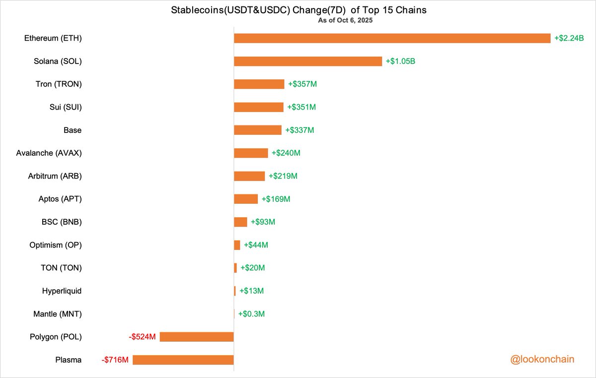 The total stablecoin market cap increased by $5.478B. Stablecoins(USDT&USDC) on #Ethereum increased by $2.24B and Stablecoins(USDT&USDC) on #Plasma decreased by $716M.