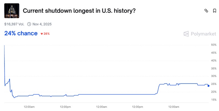 On the Kalshi website, a bet on the duration of the government shutdown shows a 69% probability that the shutdown will last more than 15 days, with a 41% probability that it will exceed 25 days. On the Polymarket platform, most cryptocurrency users predict that this U.S. government shutdown will become the longest in U.S. history, with about a 72% probability that it will not end until after October 15.