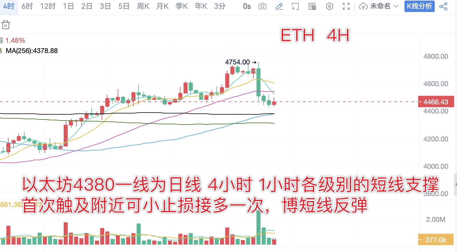 From the daily chart of Ethereum, it also closed with a large bearish candle yesterday, breaking below the previous day's candlestick. The daily chart is about to retest the MA30/60 moving average at the 4400 level. If it retests this level and holds, it can still look for a rebound. At the 4-hour level, it has been in a continuous oscillating decline. The key support level below is the MA256 moving average at the 4380 level. If it retests the 4300-4380 range during the day, it is considered possible to go long based on the support level.