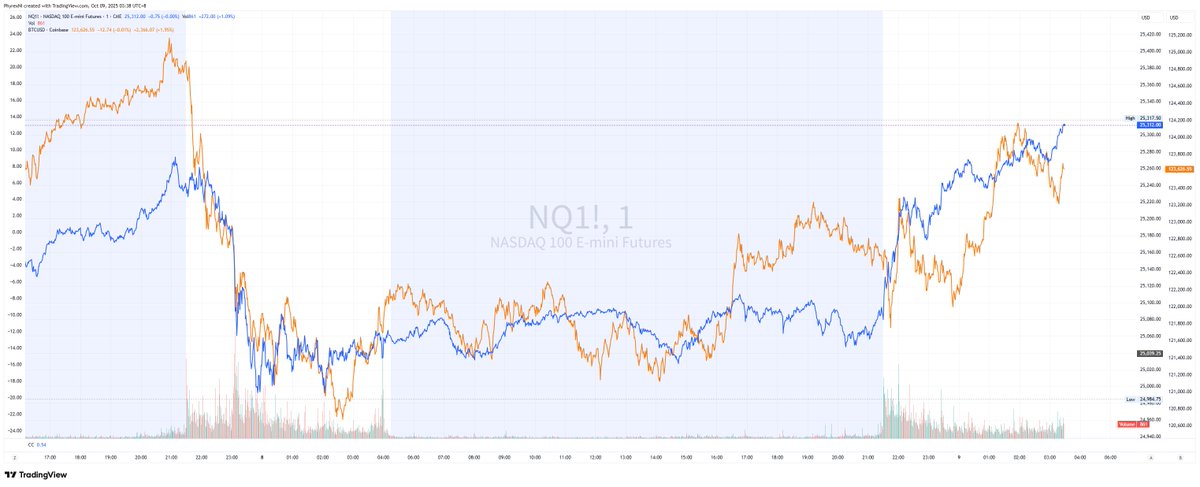 I believe many friends want to know the reason for the rise. I dug into the minute-level data; the blue line represents Nasdaq futures, and the orange line represents Bitcoin. It's clear that the two have a high degree of correlation. The Nasdaq started to see an increase in trading volume from the opening, and it continued to rise, which corresponds to BTC as well. During this period, there were no significant positive news or data.