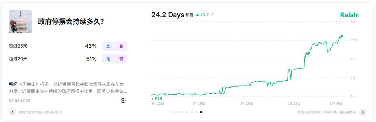 Today, the Republican bill failed to secure enough votes in the Senate to end the US government shutdown, so the shutdown will continue. According to data from Kalshi, US investors believe the shutdown will extend to 24 days, which would perfectly miss the CPI and PPI data, and the Federal Reserve at the end of the month will enter a "blind guessing" phase.