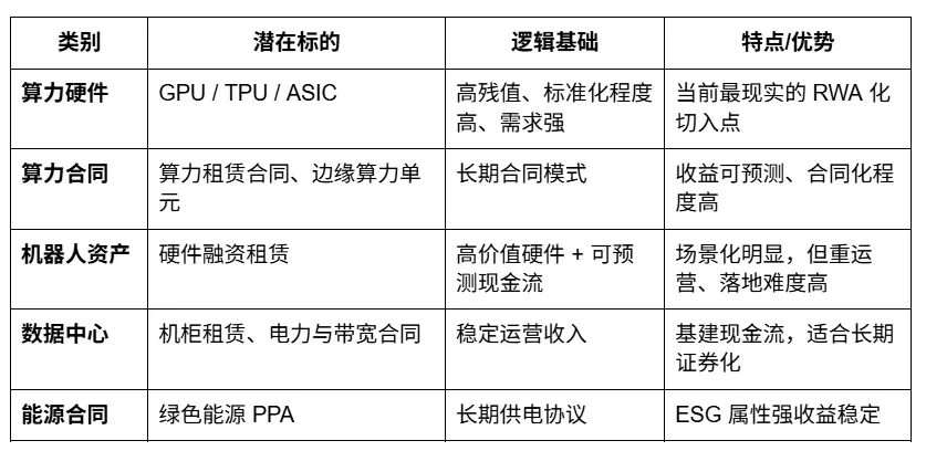 In AI computing assets, hardware like GPUs is widely regarded as the primary entry point for RWAization due to its clear residual value, high standardization, and strong demand. The computing layer can also be further extended to computing lease contracts, which have a cash flow model that is contractual and predictable, making them suitable for securitization.