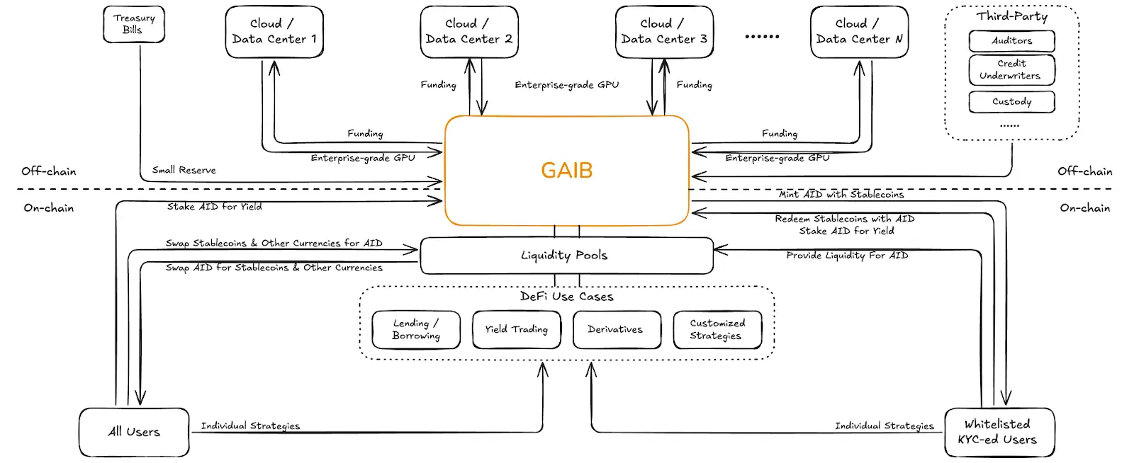 Funding Side: Through a dual-layer structure of AID (stable settlement, non-interest-bearing, T-Bills reserves) and sAID (yield-bearing fund tokens, underpinned by financing portfolios + T-Bills), GAIB achieves stable circulation and separation of yield capture. It releases yield and liquidity through DeFi integrations such as PT/YT, lending, and LP liquidity.