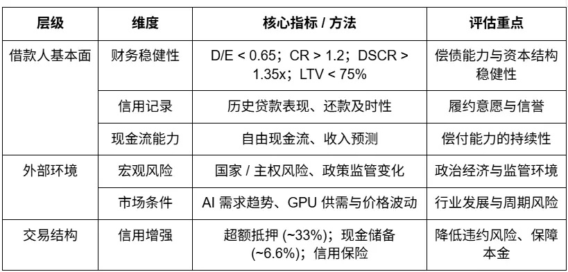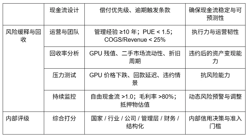 Credit and Risk Control: Ensuring safety through over-collateralization (about 30%), cash reserves (5–7%), credit insurance, and default handling (GPU liquidation/custodial operations); combined with third-party underwriting and due diligence, an internal credit rating system is established.