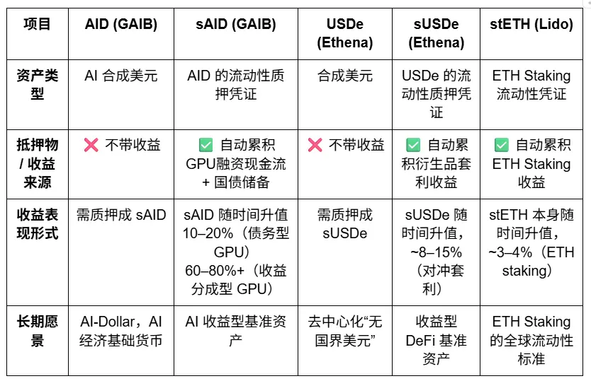 The relationship between AID and sAID can be likened to Ethena's USDe/sUSDe and Lido's ETH/stETH: the former, as a synthetic dollar, does not generate yields by itself, and only accumulates yields automatically after being converted into sTokens. The difference lies in that the yield of sAID comes from GPU financing contracts and U.S. Treasuries, while sUSDe's yield comes from derivative hedging, and stETH relies on ETH staking.