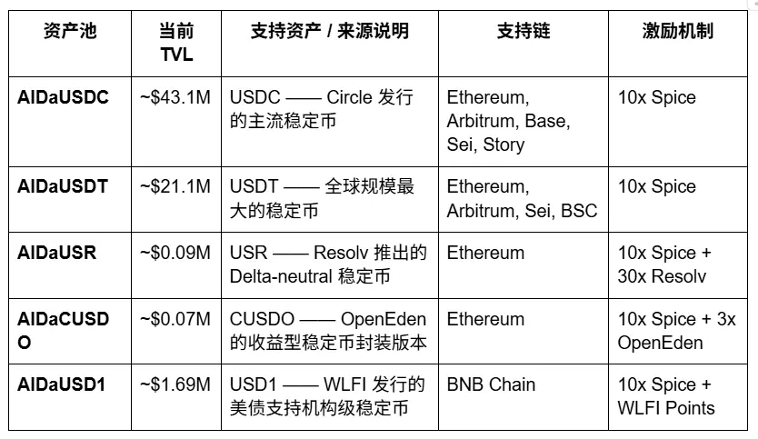 In the Final Spice phase, GAIB opened diversified stablecoin entry points through the AIDα mechanism, including USDC, USDT, USR, CUSDO, and USD1. After users deposit stablecoins, they will receive corresponding AIDα receipt tokens (e.g., AIDaUSDC, AIDaUSD1), which represent deposit certificates and are automatically counted in the Spice points system, allowing further participation in DeFi combinations like Pendle and Curve.