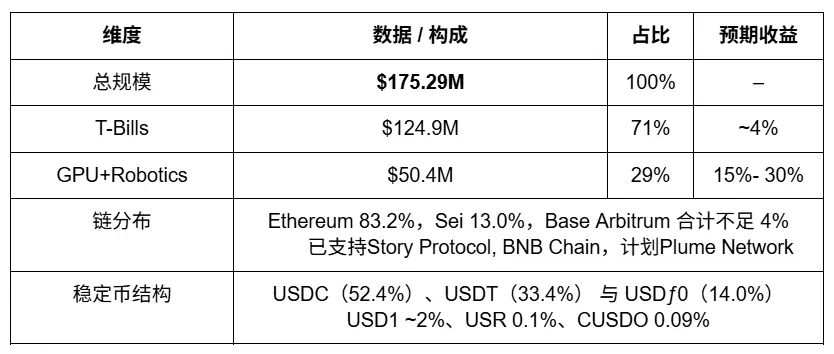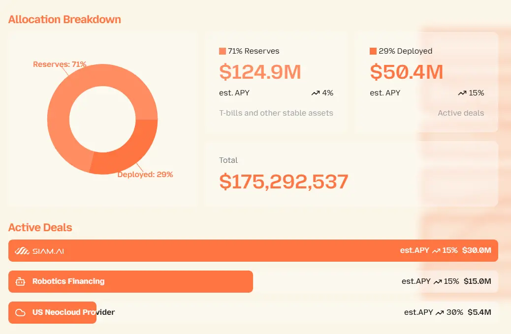Deployed assets (Deployed) account for 29%, approximately $50.4M, used for off-chain GPU and robot financing projects, with an average annualized yield of about 15%.