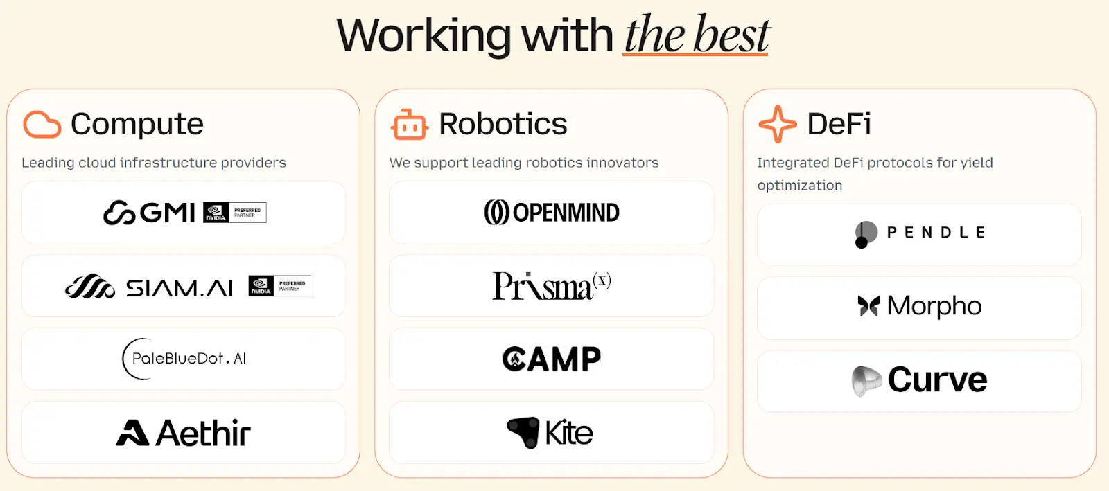 GAIB has officially entered the embodied AI sector, extending the GPU Tokenization model to the robotics industry, building a "Compute + Robotics" dual-engine ecosystem centered on SPV collateral structures and cash flow distribution, and packaging robot and GPU yields through AID/sAID to achieve on-chain financialization of hardware and operations. Currently, a total of $15 million has been deployed in robot financing, with an expected annualized yield of about 15%. Partners include OpenMind, PrismaX, CAMP, Kite, and SiamAI Robotics, covering multi-dimensional innovations in hardware, data flow, and supply chain.