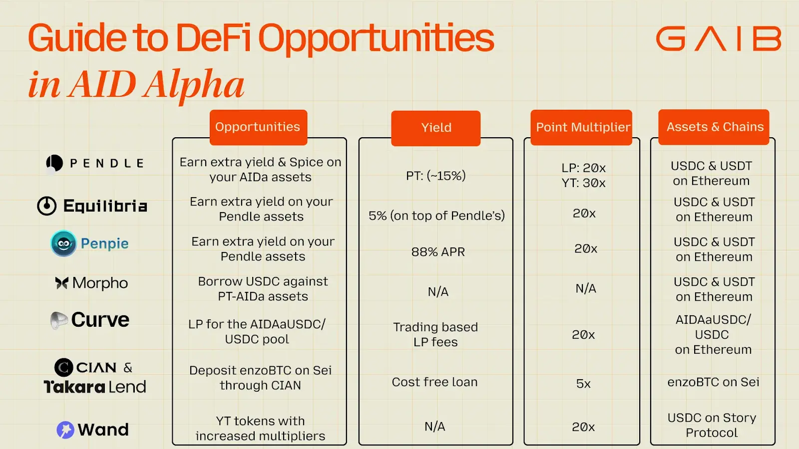 During the AID Alpha phase, GAIB deeply integrated AID/aAID assets with various DeFi protocols, forming a cross-chain, diversified yield optimization system through yield splitting, liquidity mining, collateral lending, and yield enhancement, with Spice points serving as a unified incentive.