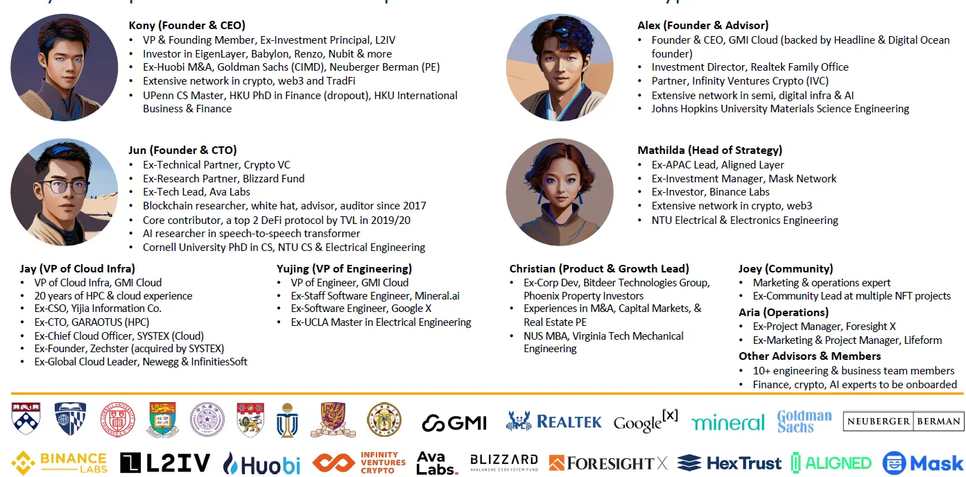 The GAIB team brings together experts from the fields of AI, cloud computing, and DeFi, with core members having previously worked at institutions such as L2IV, Huobi, Goldman Sachs, Ava Labs, and Binance Labs. Team members graduated from Cornell University, the University of Pennsylvania, Nanyang Technological University, and the University of California, Los Angeles, possessing deep experience in finance, engineering, and blockchain infrastructure, collectively building a solid foundation connecting real-world AI assets with on-chain financial innovation.