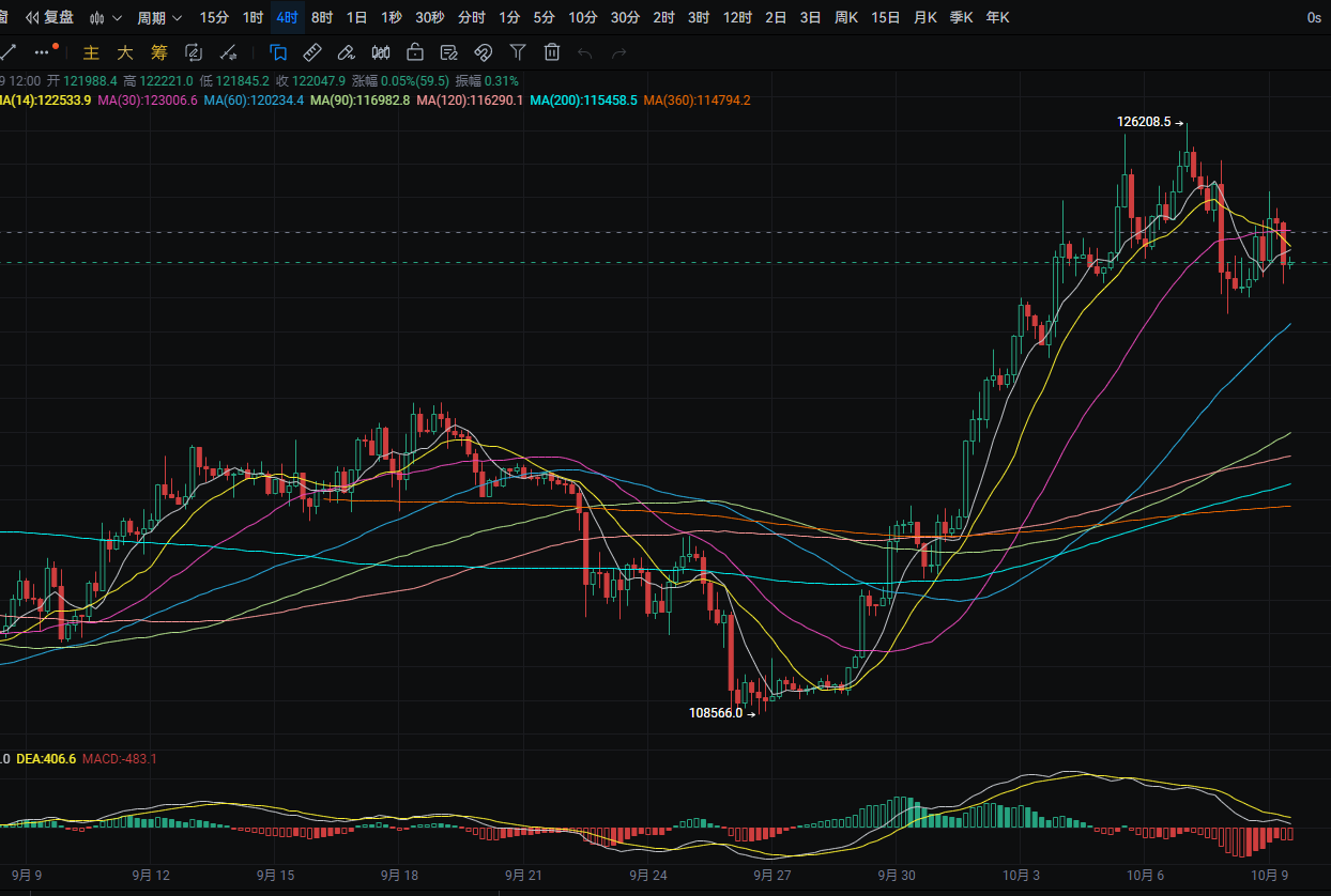 Bitcoin's daily line rose from a low of around 121,000 to a high of around 124,150 yesterday, closing around 123,250. The support level is around 120,500; if it breaks, we can look to MA14. A pullback can be bought around this area. The resistance level is around 123,400; if it breaks, we can look to 124,700. A rebound to this area can be a short opportunity. MACD shows a decrease in bullish volume. The four-hour support level is around 121,300; if it breaks, we can look to MA60. A pullback can be bought around this area. The resistance level is around MA30; if it breaks, we can look to 124,350. A rebound to this area can be a short opportunity. MACD shows an increase in bearish volume.