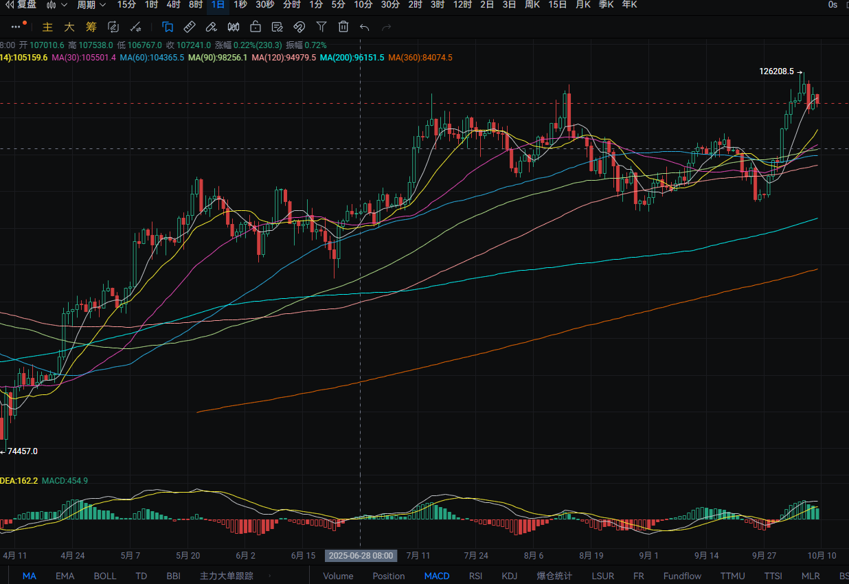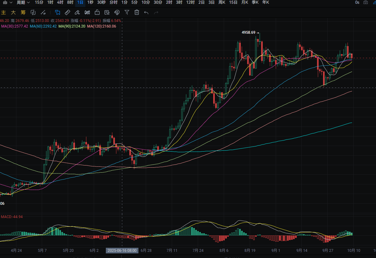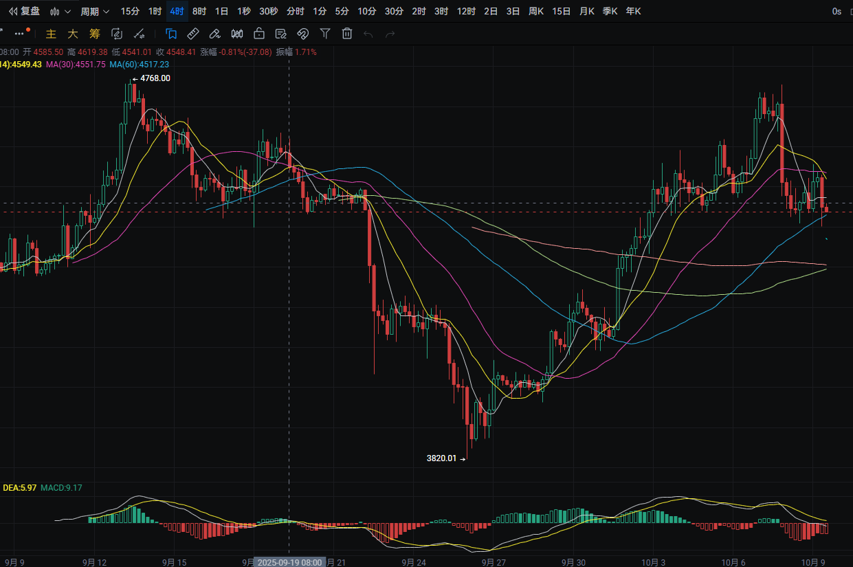 Ethereum's daily line rose from a low of around 4,410 to a high of around 4,555 yesterday, closing around 4,525. The support level is around 4,300; if it breaks, we can look to MA90. A pullback can be bought around this area. The resistance level is around 4,585; if it breaks, we can look to 4,750. A rebound to this area can be a short opportunity. MACD shows a decrease in bullish volume. The four-hour support level is around MA200; if it breaks, we can look to MA90. A pullback can be bought around this area. The resistance level is around MA14; if it breaks, we can look to 4,615. A rebound to this area can be a short opportunity. MACD shows an increase in bearish volume.