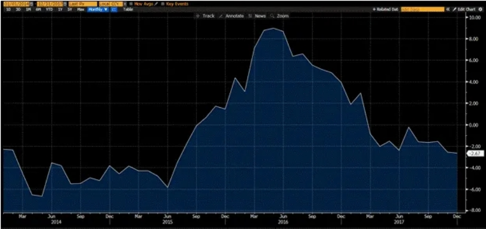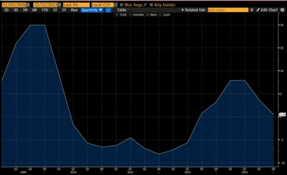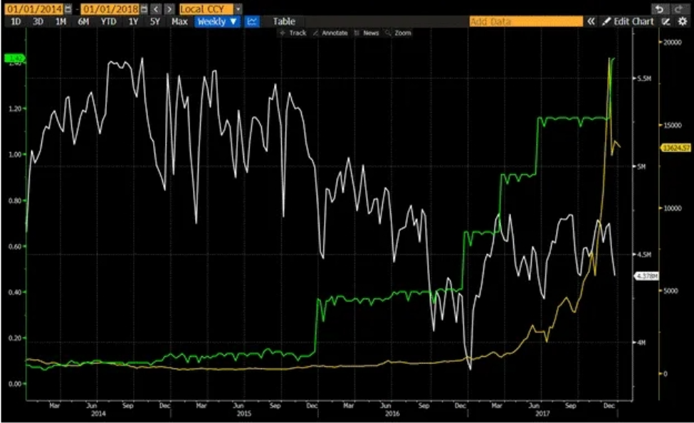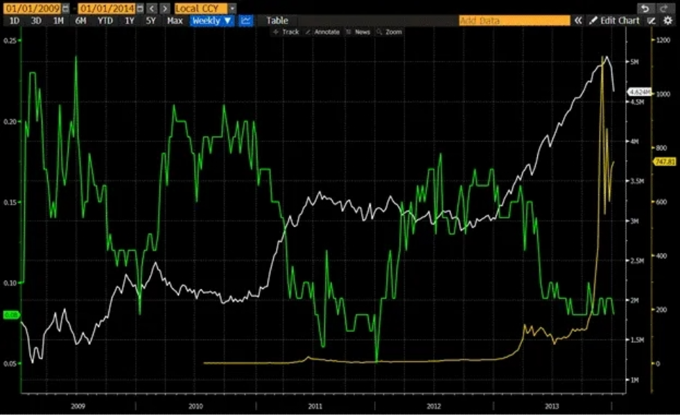 The dollar price actually touched 0%. Supply surged dramatically, peaking at the end of 2013 before retreating.