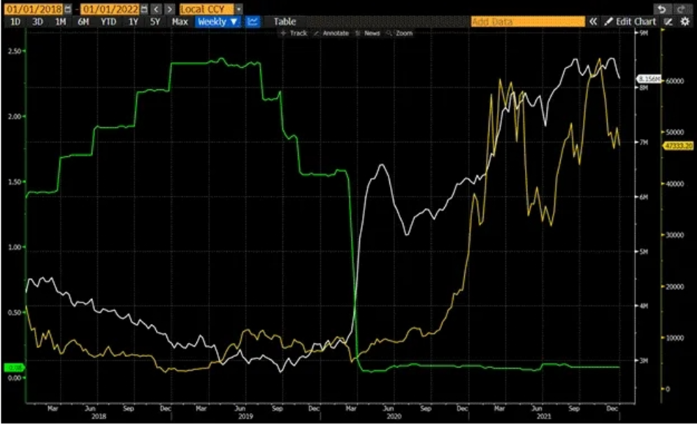 ● Dollar chart white line: An indicator measuring the price and supply of dollar credit—the sum of Federal Reserve bank reserves and other deposits/liabilities in the U.S. banking system. The Federal Reserve publishes this data weekly.